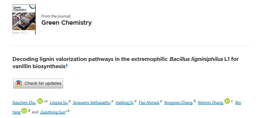 Recently, the team of researcher Zhu Daochen and Professor Sun Jianzhong of our School has made important progress in the depolymerization of lignin into vanillin. The related results are titled "Decoding lignin valorization pathways in the extremophilic Bacillus ligniniphilus L1 for vanillin biosynthesis" and published in the internationally renowned journal "Green Chemistry" in the field of green sustainable development.