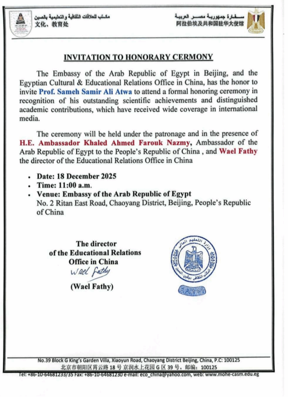 On December 18, 2025, Dr. Sameh Samir Ali Atwa was formally honored at the Embassy of the Arab Republic of Egypt in Beijing with a high-level foreign commendation.