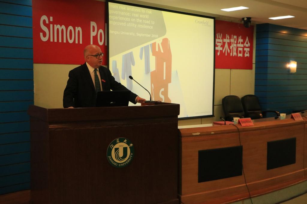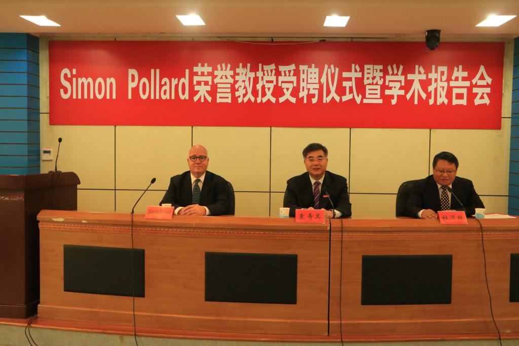 The appointment ceremony of honorary professor for Simon Pollard, DSc FREng, followed by his academic report, was held at No. 3 auditorium of Jiangsu University Conference Centre, on the afternoon of 10 September, 2018. Prof. Yuan Shouqi, Chairmangsu University, chairman chair of the Party committee of Jiangsu University; Prof. Wu Xiangyang, Dean of School of the Environment and Safety Engineering; and Prof. Du Daolin, Deputy Dean of School of the Environmental and Safety Engineering attended the ceremony. About 100 representatives of teachers and students from School of the Environmental and Safety Engineering and School of Material Science and Engineering were present at the ceremony and listened to the report. The ceremony was presided over by Prof. Du Daolin.
