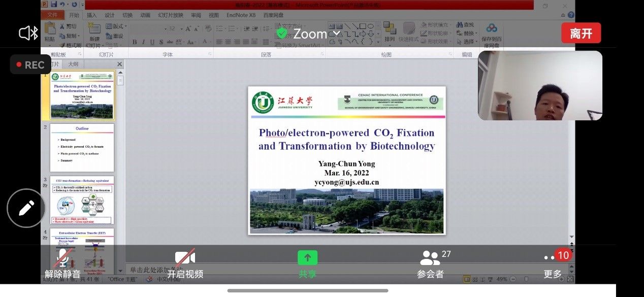 Overcoming the impact of the epidemic, our school carefully organized nearly 30 teachers and students to participate in the meeting. Dean of our shcool Professor Du Daolin (Dean of our shcool) was invited to give a speech. In his speech, Dean Du analyzed the problems and challenges in the field of global ecological environment and emergency management in the post-epidemic era. Dean Du hopes to deepen understanding and cooperation with international counterparts through this conference; Professor Yong Yangchun, Dean of Biofuels Institute, as the Chinese sponsor of the conference, gave a conference report entitled "Photo/electron-powered CO2 Fixation and Tansformation by Biotechnolgy".