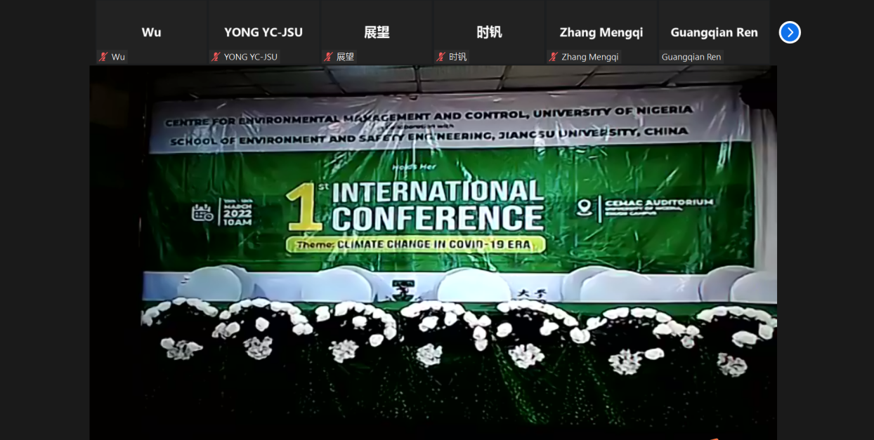 From March 15th to 18th, 2022, the first "CLIMATE CHANGE IN" was hosted by the Center for Environmental Management and Control, University of Nigeria, and co-organized by the School of Environment and Engineering, Jiangsu University (including Biomass Energy Research Institute, Environmental Health and Ecological Security Research Institute). The "COVID-19 ERA" International Conference was successfully held at the beautiful University of Nigeria. The conference focused on sustainable development in the post-epidemic era, aimed at the challenges of global climate change management and emergency management, and aimed to discuss the latest cutting-edge theories and technologies in related fields. Researchers from many countries participated in this international conference on-site/online.