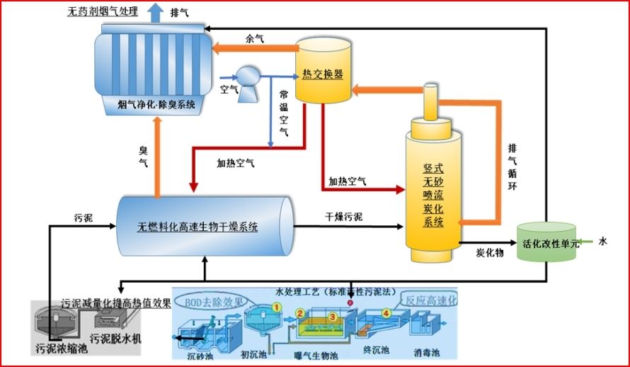图2 污泥生物干燥/炭化节能系统及炭化物资源化利用技术