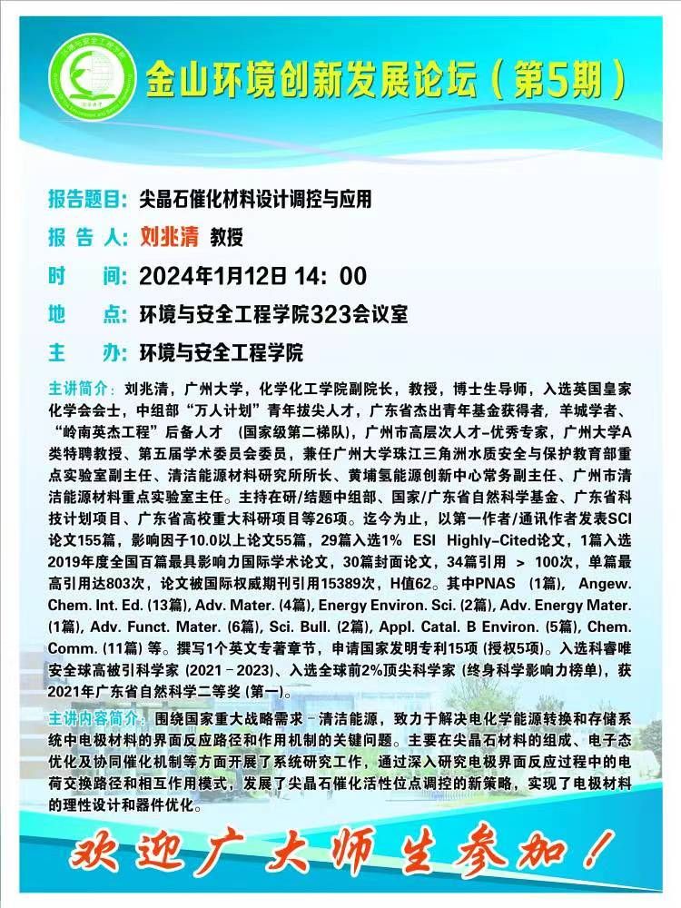 报告人简介:刘兆清,广州大学,化学化工学院副院长,教授,博士生导师,入选英国皇家化学会会士,中组部“万人计划”青年拔尖人才,广东省杰出青年基金获得者, 羊城学者、“岭南英杰工程”后备人才 (国家级第二梯队),广州市高层次人才-优秀专家,广州大学A类特聘教授、第五届学术委员会委员,兼任广州大学珠江三角洲水质安全与保护教育部重点实验室副主任、清洁能源材料研究所所长、黄埔氢能源创新中心常务副主任、广州市清洁能源材料重点实验室主任。主持在研/结题中组部、国家/广东省自然科学基金、广东省科技计划项目、广东省高校重大科研项目等26项。迄今为止,以第一作者/通讯作者发表SCI论文155篇,影响因子10.0以上论文55篇,29篇入选1% ESI Highly-Cited论文,1篇入选2019年度全国百篇最具影响力国际学术论文,30篇封面论文,34篇引用 > 100次,单篇最高引用达803次,论文被国际权威期刊引用15389次,H值62。其中PNAS (1篇), Angew. Chem. Int. Ed. (13篇), Adv. Mater. (4篇), Energy Environ. Sci. (2篇), Adv. Energy Mater. (1篇), Adv. Funct. Mater. (6篇), Sci. Bull. (2篇), Appl. Catal. B Environ. (5篇), Chem. Comm. (11篇) 等。撰写1个英文专著章节,申请国家发明专利15项 (授权5项)。入选科睿唯安全球高被引科学家 (2021–2023)、入选全球前2%顶尖科学家 (终身科学影响力榜单),获2021年广东省自然科学二等奖 (第一)。