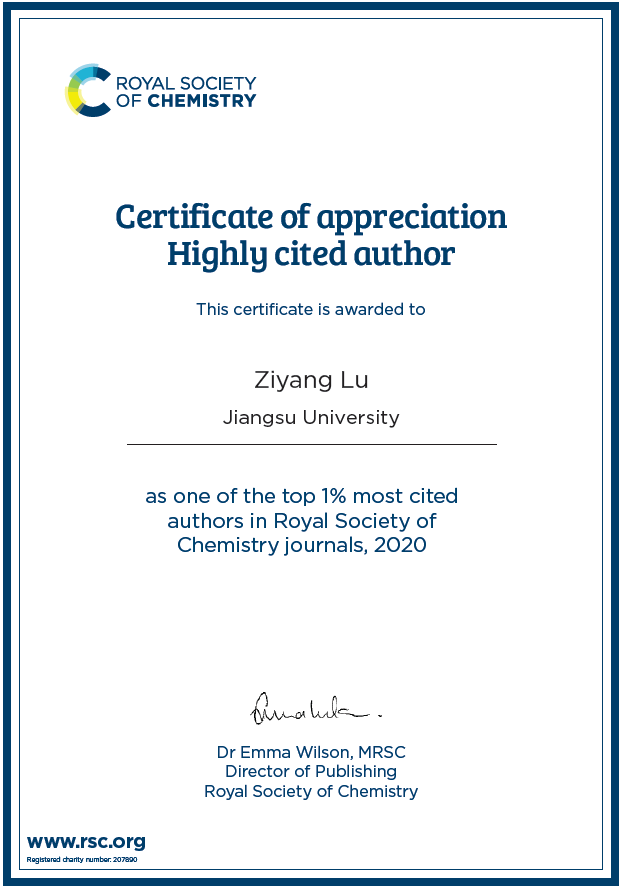 英国皇家化学会于1841年成立于伦敦,在国际学术交流、主办期刊、会议、科学研究、教育以及向公众传播科学知识等领域享有盛誉。英国皇家化学会出版的期刊多数被SCI收录,是学术研究的重要信息来源。为彰显作者对研究领域的突出贡献,英国皇家化学会对旗下四十多本期刊发表论文的引用情况进行统计,将2018、2019年发表的论文在2020年的被引次数在全球排名前1%的名单进行了筛选,这也是我院教师首次入选RSC Top 1%高被引作者。