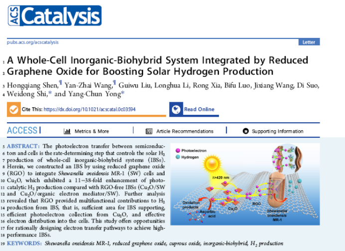 近日,我院雍阳春教授团队与化工学院施伟东教授团队合作在ACS Catalysis杂志上发表最新研究成果“A Whole-Cell Inorganic-Biohybrid System Integrated by Reduced Graphene Oxide for Boosting Solar Hydrogen Production”。