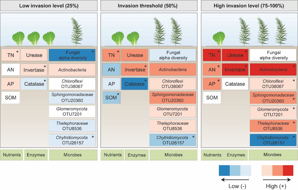 该研究基于 “植物-土壤反馈”假说,以在全球广泛入侵果园、牧场和农田等生态系统的杂草加拿大蓬作为模型,利用不同相对密度模拟不同的入侵过程,探讨了入侵植物在不同入侵进程中对土壤中化学、生化和微生物的变化情况,并进一步对相应的阈值进行了预测。结果表明随着入侵水平的加重,土壤性质发生了变化;总体上,土壤养分水平和酶活性呈现上升的趋势;而且,土壤有效氮、有机质和过氧化氢酶活性分别在入侵水平达到69%、50%和47%时出现阈值变化。同时,入侵水平的增加也影响了土壤微生物群落的结构,特别是一些与养分循环紧密相关的细菌和真菌类群的相对丰度均发生了重大变化。该研究说明由外来入侵植物驱动的土壤生物和非生物组成的变化可以导致“植物-土壤”的正反馈,从而促进入侵杂草的种群建立和扩张。