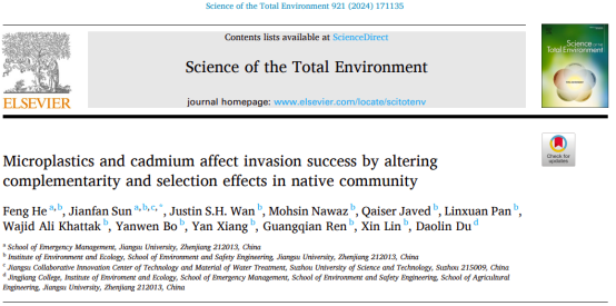 近日,我院环境生态与修复团队孙见凡老师在Science of the Total Environment (IF: 9.8)线上发表最新研究论文“Microplastics and cadmium affect invasion success by altering complementarity and selection effects in native community”。yl6809永利集团为第一完成单位,我院学生何峰为第一作者,孙见凡老师为通讯作者。