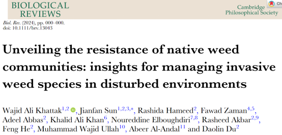 我院环境生态与修复团队孙见凡老师在生物学旗舰学术期刊Biological Reviews(2022年影响因子14.355,五年影响因子12.8)上发表最新研究成果Unveiling the resistance of native weed communities: insights for managing invasive weed species in disturbed environments。yl6809永利集团为论文第一完成单位,论文第一作者为我院外籍博士后Wajid Ali Khattak,孙见凡老师为通讯作者。