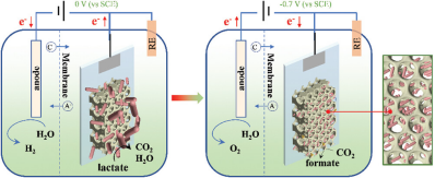 本文设计了一种由导电纳米颗粒(50 nm)组成的三维蜂窝状电极,通过理性设计每个蜂窝孔道的直径来适配单个或多个微生物细胞的尺寸,从而完成希瓦氏菌的定向“入住”,实现生物-非生物界面的高度兼容。在阳极模式下(希瓦氏菌氧化乳酸释放电能),上述电极的电池密度提高128倍,并在24小时内获得接近1.5 mA/cm-2的最大输出电流(目前报道的最高电能释放速率)。在阴极模式下(希瓦氏菌利用电能进行胞内还原反应),可以选择性还原富马酸到琥珀酸,并且其反向电流是商用碳电极的16倍。值得注意的是,在以上生物电化学反应过程中,细胞表面色素蛋白溶出铁元素并自主合成含铁的氧化物纳米颗粒(~5 nm),强化了直接和跨膜c型细胞色素电子转移。由于人工和生物合成的纳米颗粒都具有高效的电子传递性能来辅助生物电化学反应,因此在阴极上也实现了高效的生物电化学CO2还原反应。