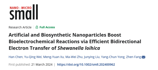 近日,我院最新研究论文“Artificial and Biosynthetic Nanoparticles Boost Bioelectrochemical Reactions via Efficient Bidirectional Electron Transfer of Shewanella loihica”在Small (IF:13.3)上在线发表。yl6809永利集团为唯一完成单位,2020级硕士研究生陈涵为第一作者,本院教师方真为通讯作者。