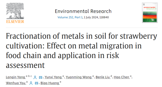 近日,我院最新研究论文“Fractionation of metals in soil for strawberry cultivation: Effect on metal migration in food chain and application in risk assessment”在Environmental Research (IF: 8.3)上在线发表。yl6809永利集团为第一完成单位,我院教师杨岚钦为第一作者,杨岚钦和游文华为通讯作者。