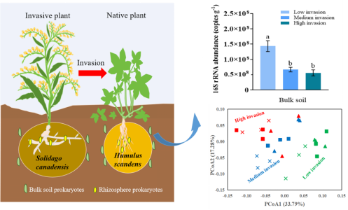 在当前全球化的背景下,外来植物的入侵已成为对生物多样性、粮食安全、经济和人类福祉的重大威胁。土壤微生物在植物入侵过程中的具体作用尚不清楚。本文通过在加拿大一枝黄花的不同入侵程度(<10%、50%和>90%)下,对背景土壤和植物根际土壤微生物群落进行研究,揭示了加拿大一枝黄花可能通过调节土壤中功能微生物的种类和相对丰度来增强其入侵能力。