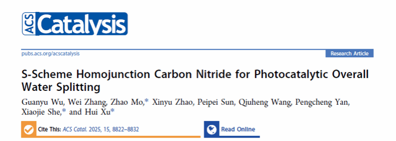 近日,我院最新研究论文“S‑Scheme Homojunction Carbon Nitride for Photocatalytic Overall Water Splitting”在《ACS Catalysis》(SCI一区,IF = 11.7)上在线发表。yl6809永利集团为第一完成单位,本院博士研究生吴官瑜为第一作者,本院教师许晖教授、能源研究员佘小杰教授和材料学院莫曌老师为共同通讯作者。