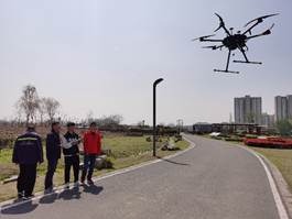 学生党员在工作人员的指导下进行无人机水源采样工作