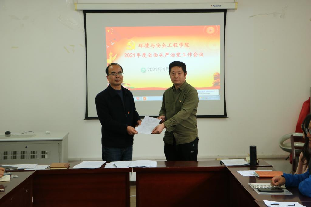 会上,学院领导班子成员、党支部书记签署了《环安学院2021年度全面从严治党责任书》。黄勇强强调,学院领导班子成员和党支部书记必须坚决扛起全面从严治党政治责任,认真履责,推进学院全面从严治党工作向纵深发展,为学院事业发展营造风清气正的政治生态和良好的干事创业环境,重点做实做细做优党史学习教育、“095工程”、“三全育人”、安全生产等工作,确保学院“十四五”开好局,为学校事业高质量发展作出新贡献。
