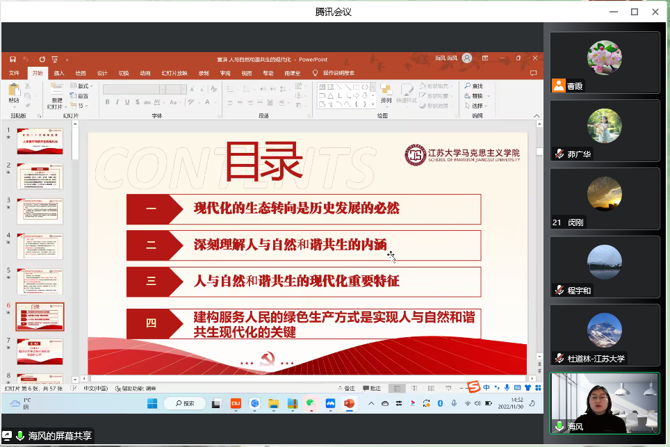 党的二十大报告提出:“中国式现代化是人与自然和谐共生的现代化”。靳媛媛博士首先强调了现代化的生态转向的历史必然性,接着详细讲解了人与自然和谐共生的现代化的丰富内涵、重要特征和实现路径,最后号召大家践行绿色发展,建构绿色生产方式,服务于广大人民对美好生活的向往和追求,为建成美丽中国作出贡献。整场讲座主题鲜明、内容丰富、分析透彻、启发性强。