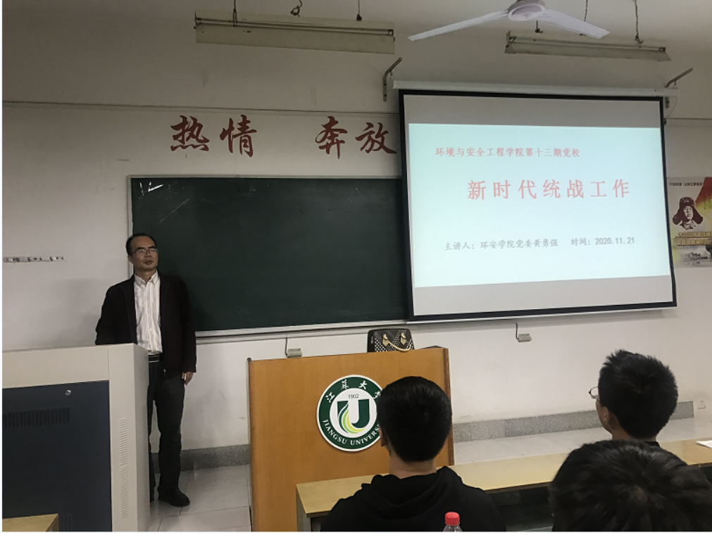 11月21日,在主A304教室,讲座顺利开展。环安学院党委书记黄勇强结合《中国共产党统一战线工作条例(试行)》,以统战工作的定义、历史、统战工作内容为主线,针对新时代统战工作的新特点、新任务,以《新时代党的统战工作》为题进行了讲座。黄勇强书记针对新时代十二类统战工作对象,重点以正确认识和处理政党、民族、宗教、阶层关系、海内外同胞等五个关系的内容和要求,向第十三期党校的学员进行了生动的讲解。