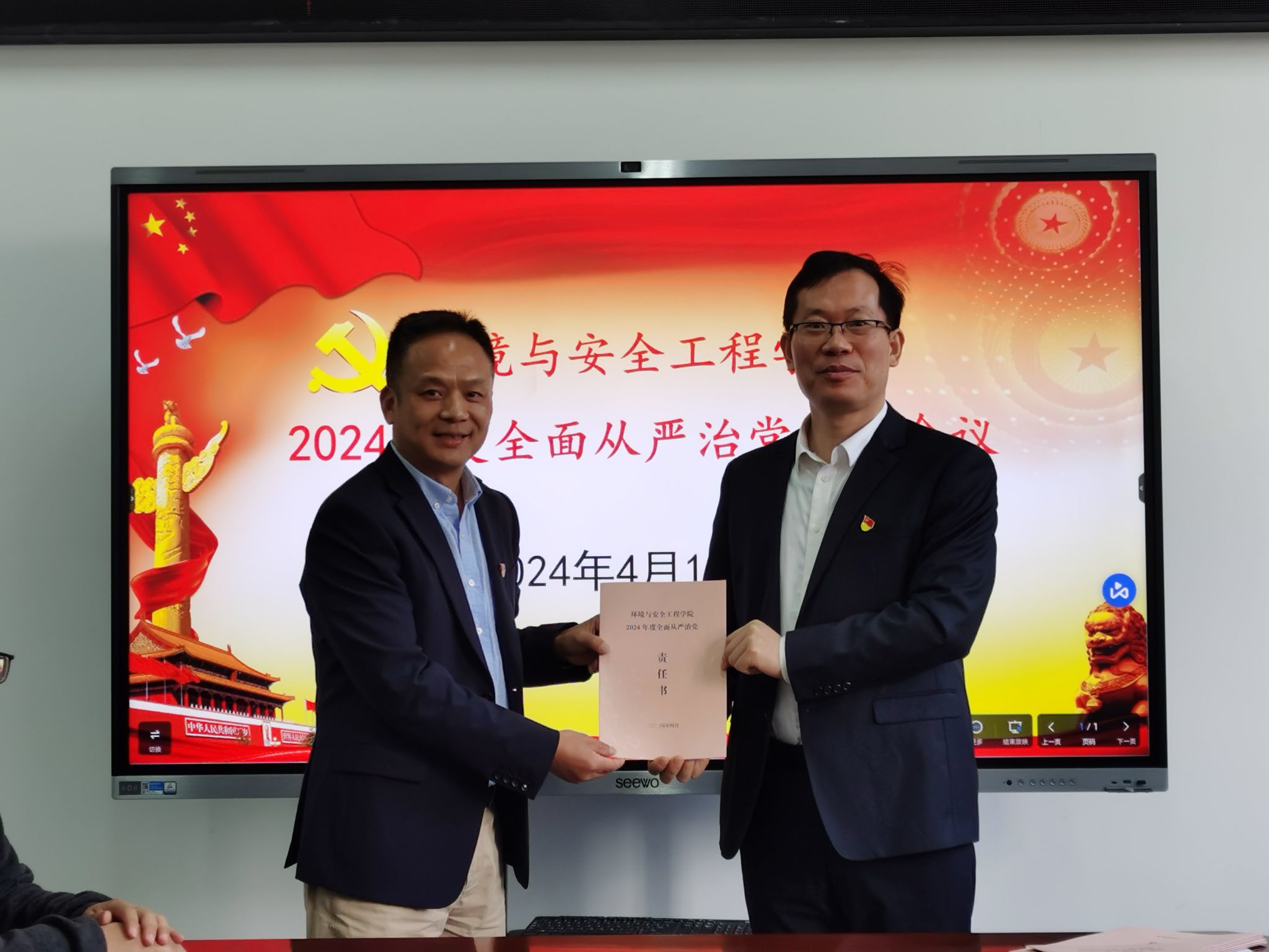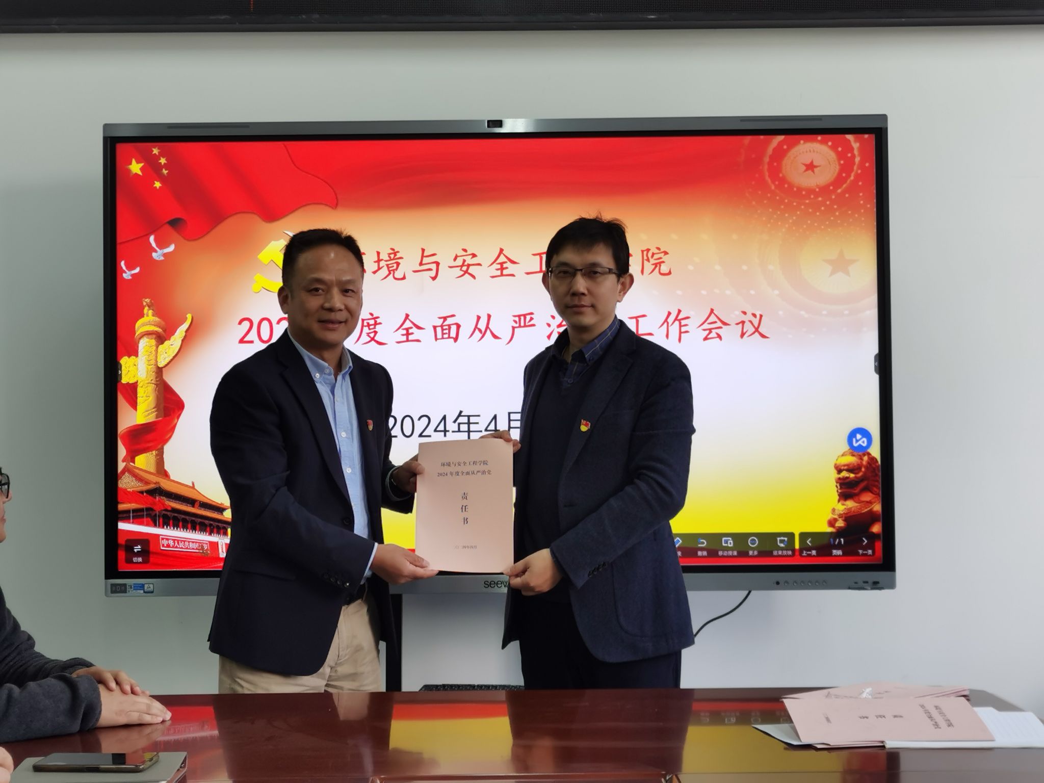 会上,夏建如解读了《环安学院2024年度落实全面从严治党党委主体责任清单》。领导班子代表、教职工党支部书记代表、学生党支部书记代表分别向院党委递交了2024年度全面从严治党主体责任书。学院党委副书记兼纪检委员赵兴联同志从六个方面总结了学院2023年度全面从严治党和党风廉政建设工作。