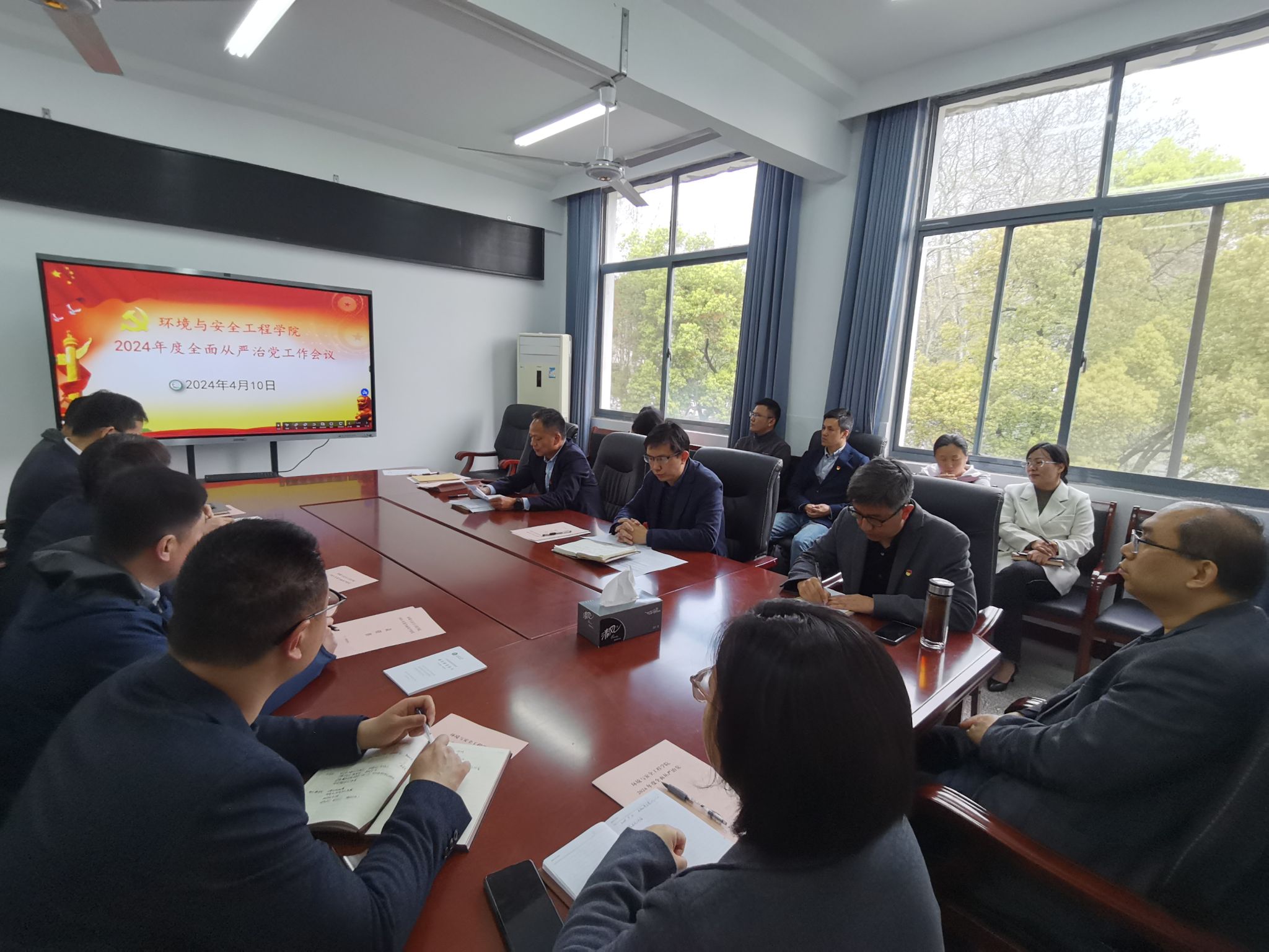 4月10日,环安学院在环安楼310会议室召开2024年度全面从严治党工作会议。学院领导班子成员、党委委员、党支部书记和纪检委员、学院二级单位主任、科级干部参加会议。会议由党委书记夏建如同志主持。